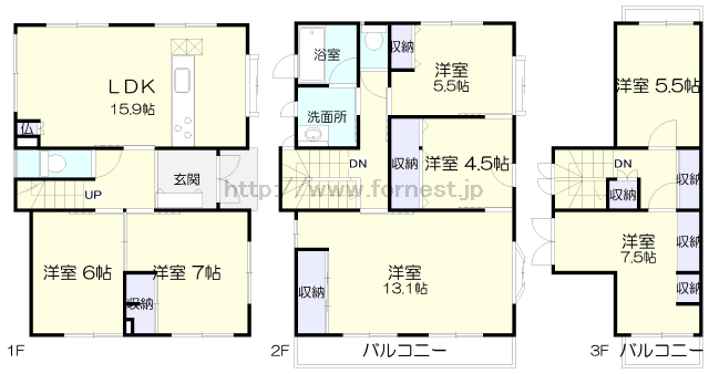 (1階)洋7、(1階)LDK15.9、(1階)店舗6、(2階)洋5.5、(2階)洋4.5、(2階)洋13.1、(3階)洋5.5、(3階)洋7.5 |