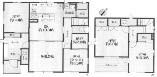 (1階)洋6、(1階)洋4.5、(1階)LDK18、(1階)納戸2、(2階)洋6.3、(2階)洋8 |